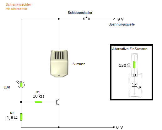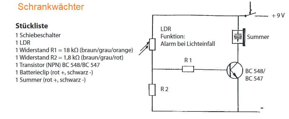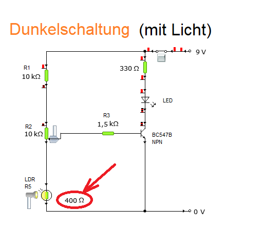 Dadurch wird der Widerstand am LDR wieder rasch größer und der Transistor sperrt.