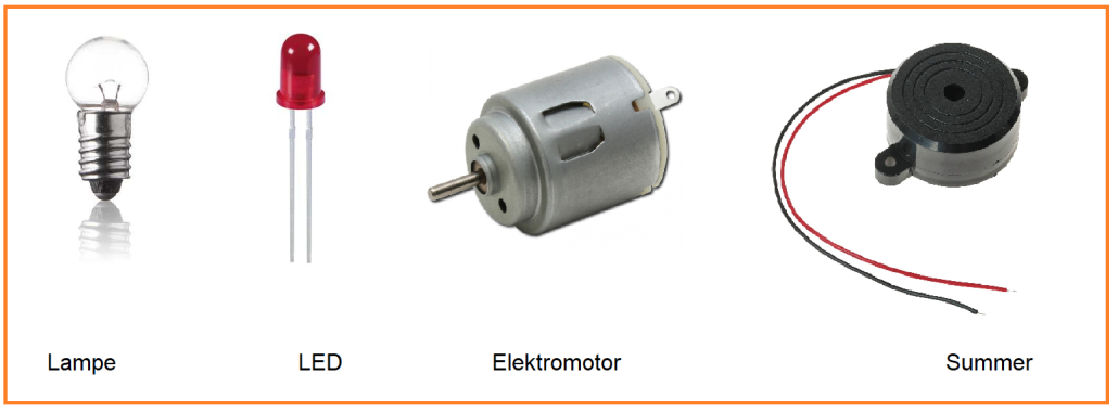 Der Strom aus der Spannungsquelle wird von sogenannten Verbrauchern umgewandelt. Über ein Kabel oder eine Leiterbahn (auf Platinen) gelangt der Strom zu den Verbrauchern und wieder zurück.
