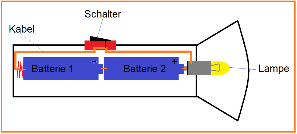 Der Strom fließt also von den Batterien 1 und 2 zur Lampe dann durch den Schalter und wieder zurück zu den Batterien.