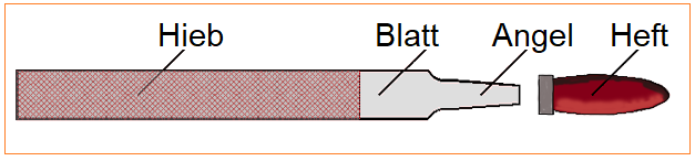 Feilen und Raspeln sind Werkzeuge zum Trennen von Werkstoffen. Auf dem Feilenblatt ist der sogenannte Hieb eingeschlagen. Der Griff, auch Heft genannt steckt auf der Angel.
