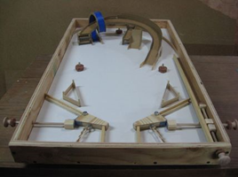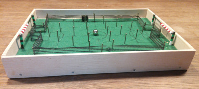 - Holzgrundplatte, Leisten, Nägel, Farbe, Stahlkugel.