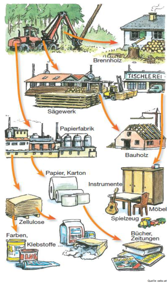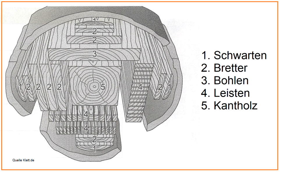 Im Sägewerk wird unterschiedliches Schnittholz herausgesägt und getrocknet. Zum Beispiel: Schwarten, Bohlen, Bretter, Kantholz, Leisten.